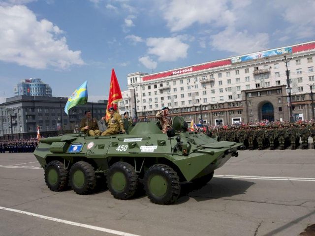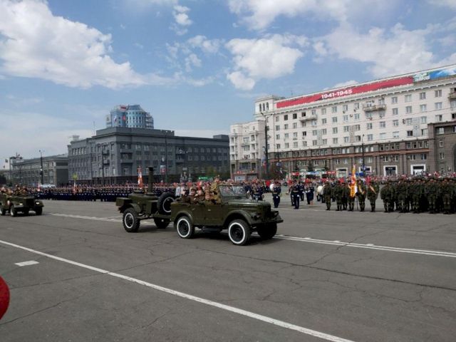 В 12 часов на площади Революции прошел традиционный военный парад. Среди парадных расчетов были роты дислоцированной в Чебаркуле 90-й гвардейской танковой дивизии, 23-го отряда спецназа войск национальной гвардии, 21-й смешанной авиадивизии, гарнизона полиции, сил региональных управлений МЧС и ГУФСИН, кадетских школ, колонна ветеранов боевых действий.