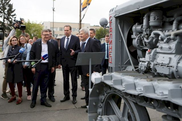 Технический директор ЧТЗ Виктор Иванов начал демонстрацию экспозиции Алексею Текслеру с исторической части — с первого трактора «Сталинец», с легендарных танков Т-34 и ИС-3 и артустановки ИСУ-152, с тракторов 50-70-х годов, которые выпускались тиражами по 300 тыс. (!), по 60-70 машин в день (!). Продолжили осмотром новенького бульдозера Б-9, самого легкого для продукции ЧТЗ класса, перешли к трубоукладчику модели ТР20, на который на предприятии делают заметную ставку, добрались и до «броневика», выкрашенного в «пустынное хаки».