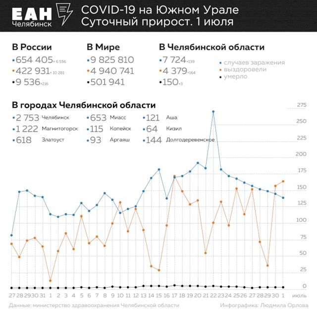 На утро 1 июля в Челябинской области зафиксировано 7 724 случая заболевания COVID-19. За последние сутки было подтверждено 139 новых случаев заражения, сообщает министерство здравоохранения региона.