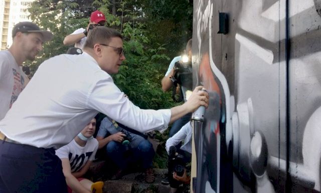 Дальше — все, как и задумано. Губернатора познакомили с художниками, после чего глава региона скинул пиджак, закатал рукава на рубашке, взял в руки баллончик и аккуратно, словно отличник, рисующий по книжке-раскраске, покрыл слоем серой краски отведенный ему участок. Что сказать, композиция стала выглядеть еще более цельно.