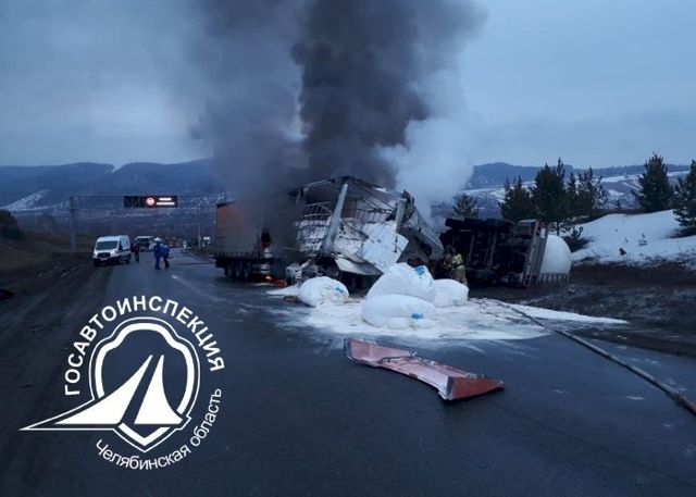 «По предварительной информации, водитель, управляя грузовым автомобилем Скания с полуприцепом, при неустановленных обстоятельствах выехал на полосу встречного движения, где совершил столкновение со встречным автомобилем «Скания» с автоцистерной под управлением водителя 1983 г.р.», – сообщили в пресс-службе ГИБДД Челябинской области.