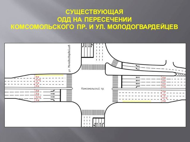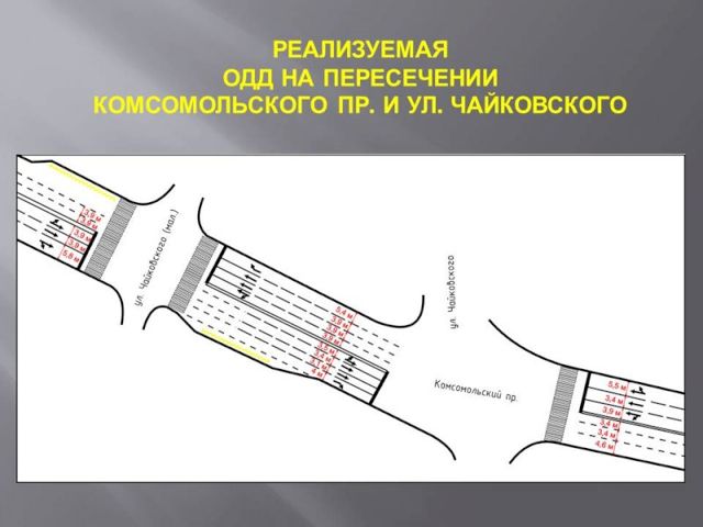 «Доведение до нормативов (ширины полос – прим. ЕАН) состоится без сокращения их количества (полос – прим. ЕАН). Средняя ширина полосы на Комсомольском проспекте составляет 3,8 м, а иногда ширина доходит до 4-х м. Выделенная полоса будет шириной 3,75, а остальные – 3,25 м по ГОСТу. За счет сужения уменьшится боковой интервал, благодаря этому стабилизируется скорость потока. Подчеркнем, что количество полос не сократится. Островки безопасности создаются не за счет уменьшения полос, а за счет их сужения. Островки будут предотвращать умышленное или неумышленное нарушение правил дорожного движения. Габариты островка будут заставлять водителей интуитивно притормаживать перед пешеходным переходом, что предотвратит количество ДТП. Водители будут знать о сужении благодаря разметке», - пояснил то, зачем это делается, вице-мэр по городскому хозяйству Максим Кулешов.