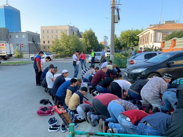 Некоторые верующие молились прямо на дороге, но полицейские попросили их уйти с проезжей части. По словам силовиков, граждане молились во дворе мечети и у ее ворот - в самом храме почти никого не было.