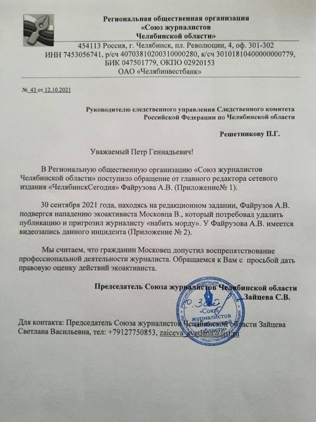 «Союз журналистов расценивает данный инцидент как прямое воспрепятствование профессиональной деятельности журналиста и обращается в правоохранительные органы Челябинской области с просьбой дать правовую оценку действий экоактивиста Василия Московца», - сообщили в СЖР ЧО.