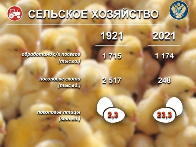 Численность городов за этот период выросла более чем в 10 раз – с 208 тыс. человек до 2,8 млн. Более чем в два раза сократилось сельское население – с 1 млн 354 тыс. человек до 598 тыс. Обработка сельскохозяйственных посевов упала с 1 715 тыс. га до 1 174 га, поголовье скота – с 2,5 млн голов до 248 тыс., а вот птицы – выросло с 2,3 тыс. голов в 10 раз.