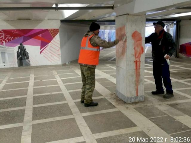 В ночь на 20 марта вандалы разрисовали стены в подземном пешеходном переходе в Челябинске на пересечении проспекта Ленина — ул. Кирова — ул. Воровского. Теперь сотрудники челябинского МБУ «Геоцентр» счищают краску. Об этом сообщили в городской мэрии.