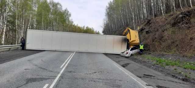 В Челябинской области на трассе М-5 сегодня утром произошла авария. Большегруз опрокинулся набок и полностью перегородил дорогу.