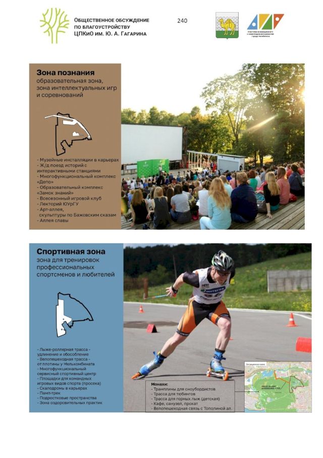 4. Зона познания – зона, частично размещенная в лесной части парка, с объектами, гармонично вписанными в ландшафт. Обязательна очистка акватории карьеров от прибрежных кустов и ила; санитарная обрезка и возобновление зеленых насаждений; благоустройство и освещение территории.