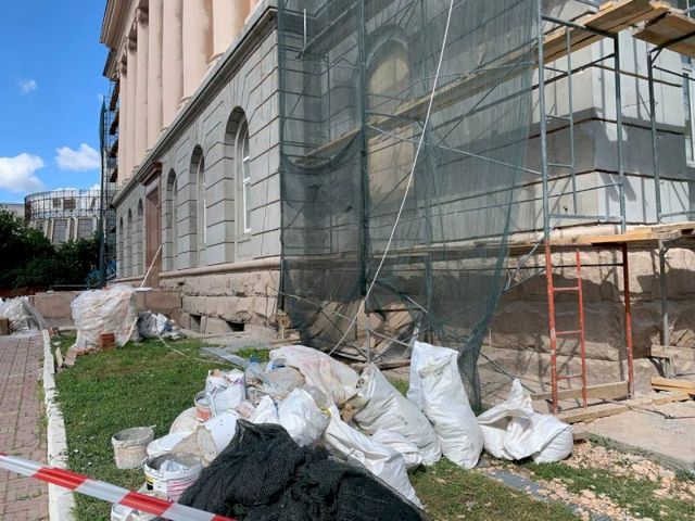 «Подрядчик ни на день не выбился из графика, все идет даже с небольшим запасом времени. Фасад будет немного раньше отремонтирован – 15 октября. Сейчас выполнен проект, идут работы по закладке маршрута подсветки, чтобы потом не долбить по готовому», – прокомментировал Алексей Бетехтин.