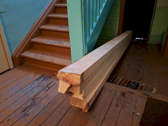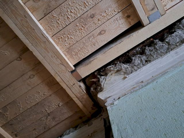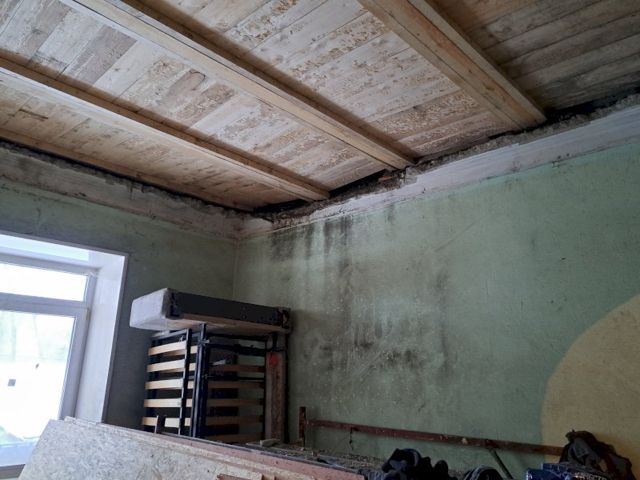 Рабочие от управляющей компании «Ремжилзаказчик» вынесли из квартиры мусор и сломанную мебель. Уже частично построен потолок – поверх установят натяжной. Впрочем, хозяев жилья удивило качество ремонта: постройка искривлена, доски заменены не полностью. Поскольку некоторое время в строении были дыры, помещение заметно остыло.