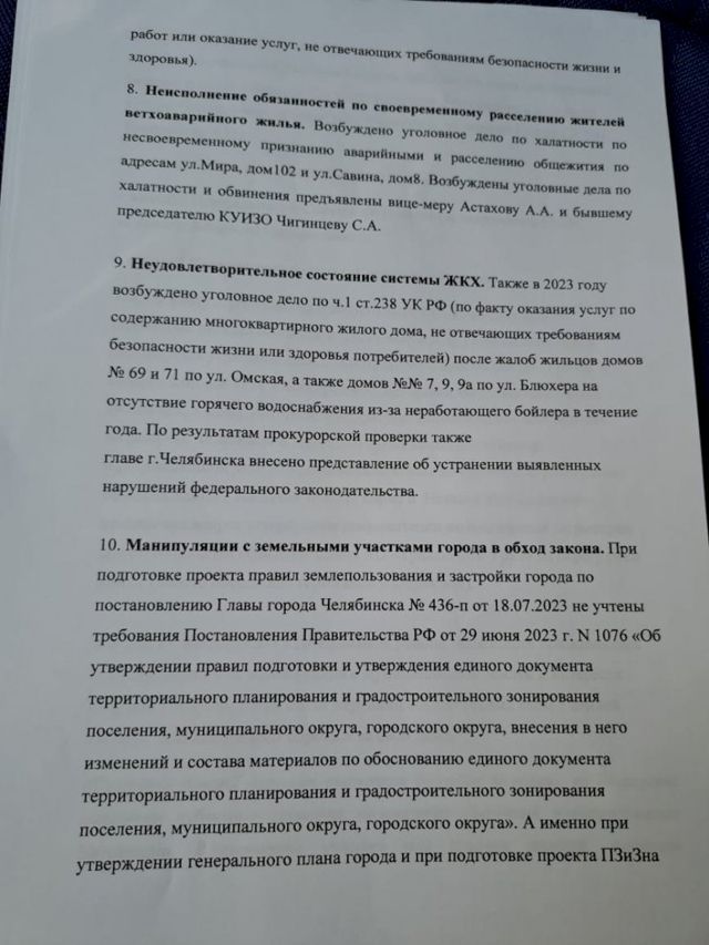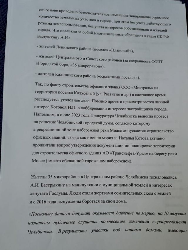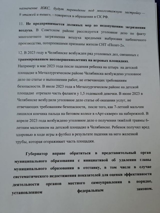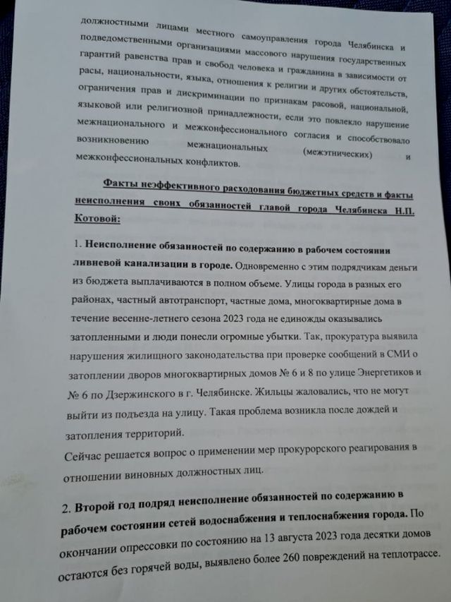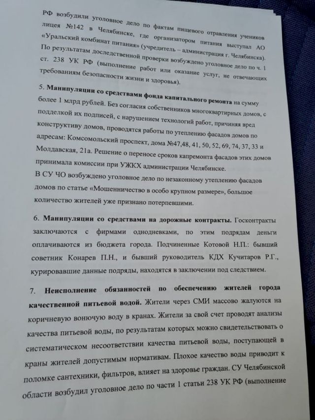 К сбору подписей под заявлением об отставке главы Челябинска Натальи Котовой кроме жителей Центрального, Калининского и Ленинского районов подключаются горожане из Металлургического и Советского. В каждом есть свои инициативные группы. Они уверяют, что это не спланированная акция, а желание горожан привлечь внимание властей к проблемам застройки, ЖКХ, озеленения и благоустройства мегаполиса. Всего в тексте обращения к губернатору Алексею Текслеру с просьбой инициировать отставку мэра - аргументы и требования на девяти листах.