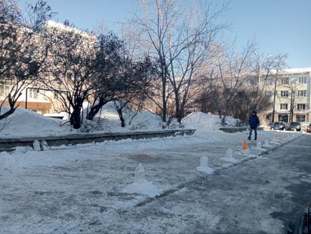 В Челябинске разгорается борьба с автохамами. Автомобилисты каждый день парковали автомобили на тротуаре у кинотеатра Пушкина. Машины мешали пешеходам, поэтому активисты решили бороться с водителями с помощью пятилитровых бутылок с замерзшей водой.