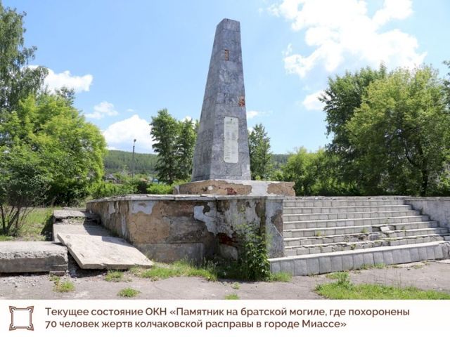 Власти Миасса (Челябинская область) на полтора года просрочили ремонт объекта культурного наследия «Памятник на братской могиле, где похоронены 70 человек жертв колчаковской расправы» на площади Революции. Об этом сообщили в «Народном фронте».