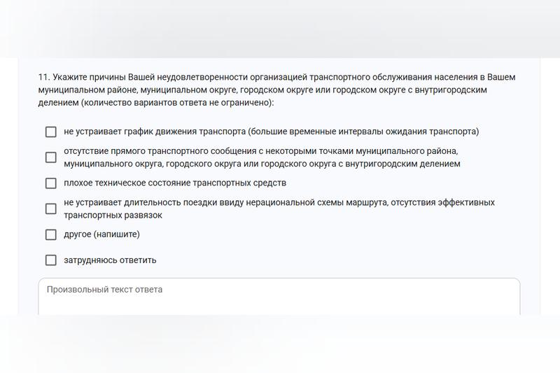 Среди вопросов о сферах жизни города есть, например, транспортный. У жителей интересуются, довольны ли они тем, как ездят автобусы, троллейбусы и трамваи. Также у горожан спрашивают о качестве дорог и услуг ЖКХ, состоянии внутридворовых территорий (проездов, тротуаров).