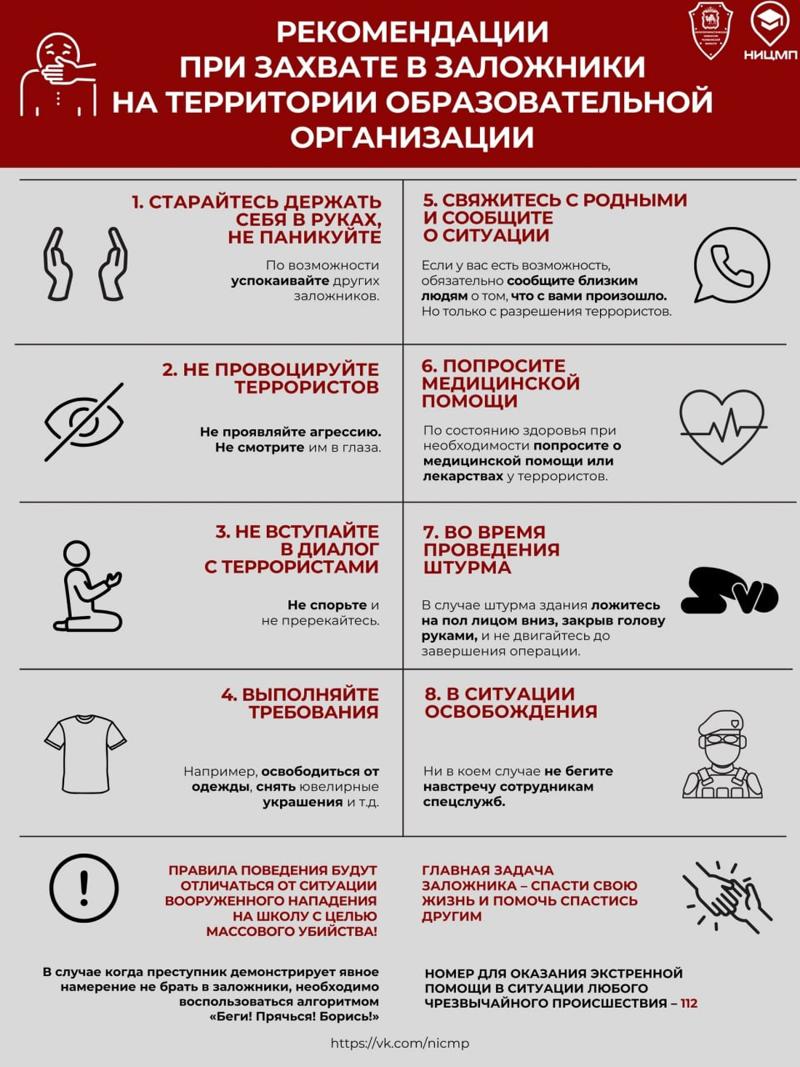 В центре подчеркнули, что соблюдение правил может спасти жизнь. Первое, что рекомендуют, - держать себя в руках, не паниковать и не провоцировать террористов. При этом не следует вступать с захватчиками в диалог, подчеркивают авторы памятки.
