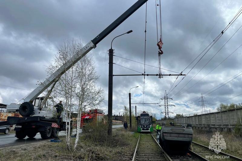 «Перевернутый автомобиль был поставлен на колеса, трамвайные пути освобождены, движение восстановлено», - сообщили в МЧС.