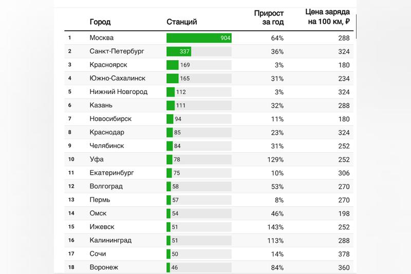 Далее в рейтинге стоят Нижний Новгород (112 станций, рост 3%), Казань (111, 32%), Новосибирск (94, 11%), Краснодар (85, 23%). У Челябинска, идущего следом, 84 станции, рост 31%. Замыкает десятку Уфа с показателями 78 и 129%.