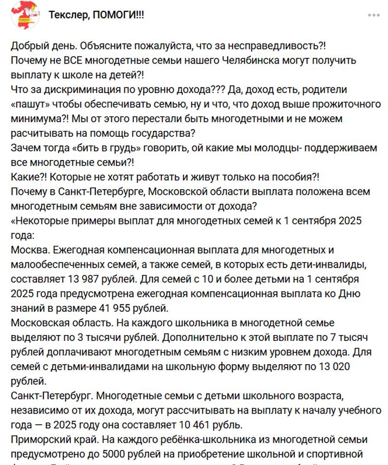 Жители Челябинской области устроили онлайн-дискуссию на тему выплат семьям для подготовки детей к школе. Масштабное и эмоциональное обсуждение развернулось под постом в группе «Текслер, помоги!» во «ВКонтакте».