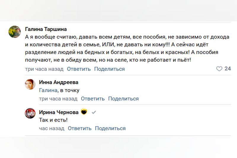 В посте она привела данные по выплатам в других регионах России и написала, что там деньги дают независимо от размера доходов.