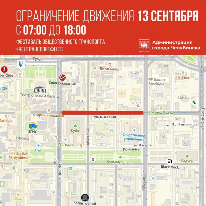 В Челябинске в субботу, 13 сентября, на время праздничных мероприятий, посвященных Дню города, будет полностью закрыто движение транспорта на нескольких участках. Список и схемы предоставили в мэрии.