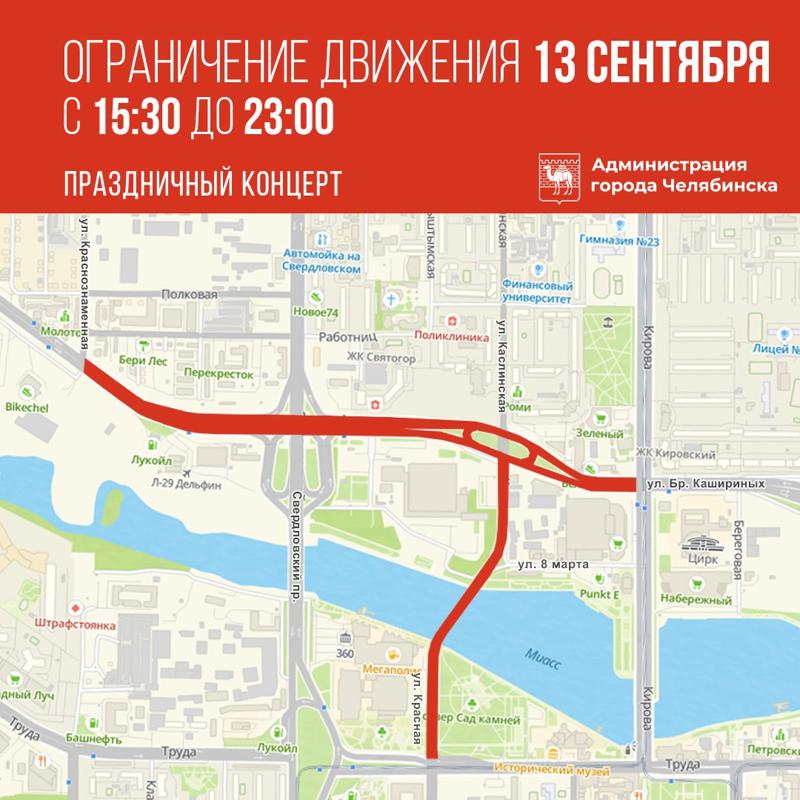 С 15:30 до 23:00 перекроют Братьев Кашириных от Краснознаменной до Кирова, Каслинскую от 8 Марта до Братьев Кашириных и Красную от Труда до 8 Марта.