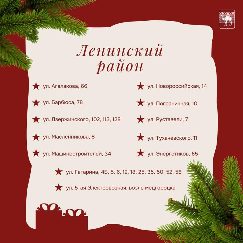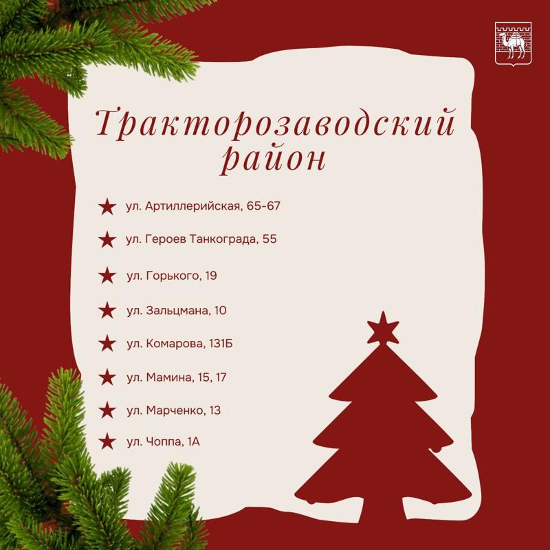 В Тракторозаводском районе елки и сосны можно приобрести на Артиллерийской, Героев Танкограда, Горького, Зальцмана, Комарова, Мамина, Марченко и Чоппа. В Центральном базары работают на Академика Королева, Братьев Кашириных, Воровского, Труда, Энтузиастов, Худякова и площади МОПРа.