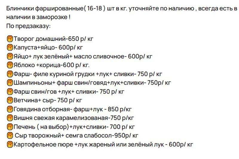 Цены на сладкие блины стартуют от 130 рублей. В качестве начинки предлагают шоколадную пасту, вареную сгущенку. Также на сайте объявлений предлагают приобрести блинные рулеты с кремовой начинкой. За 800 г такого угощения просят 1 тыс. 850 рублей. Самое дорогое предложение на сайте объявлений — бокс с блинами с красной икрой. Его продают за 4,9 тыс. рублей. Автор объявлений не указал, сколько блинов идет в наборе.