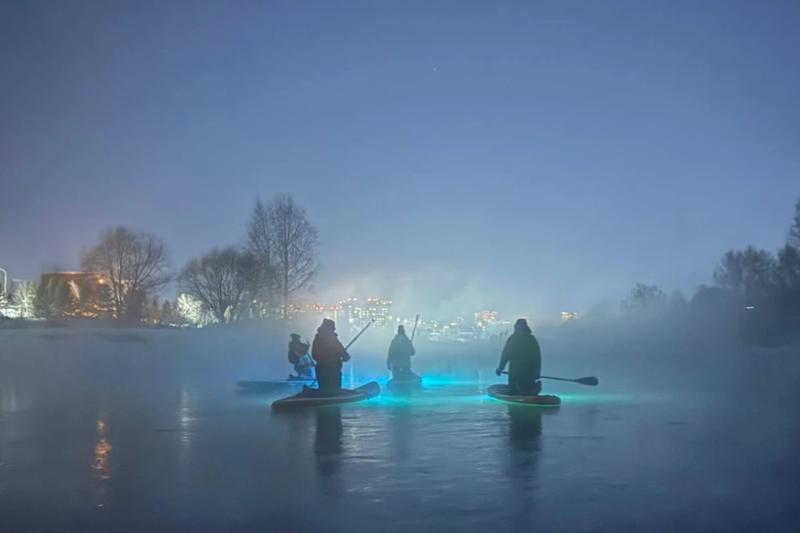 Любители активного отдыха отправились на сплав ночью. Прогулка проходила под светом фонарей и в клубах тумана. Идея проведения сап-прогулок по городу зимой принадлежит Алене Галиакберовой.