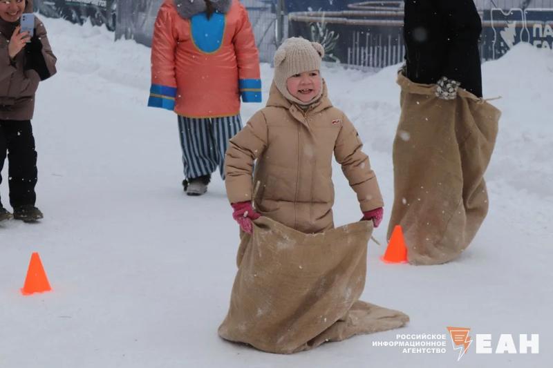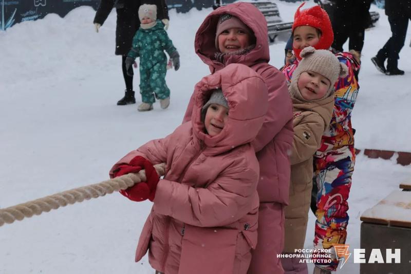 Для гостей праздника организовали традиционные масленичные забавы. Посетители могли посоревноваться в метании блинов и валенок, в беге в мешках и гигантских валенках, а также в перетягивании каната.
