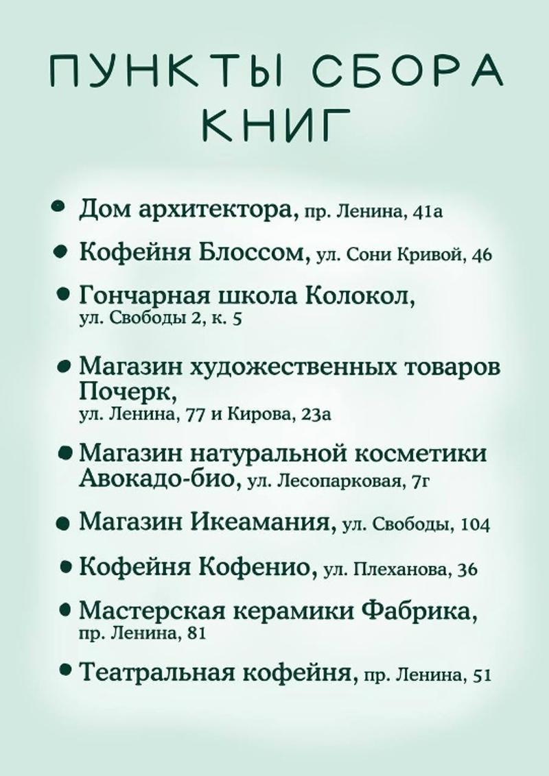 В пунктах принимают издания не старше 2000 года и в хорошем состоянии. Все собранное выставят на продажу. Вырученные деньги направят в АНО «Жизнь», которая реализует проект «Автобус жизни». Волонтеры на этом автобусе, который оборудован как мобильная столовая, в разных местах города кормят обездоленных.