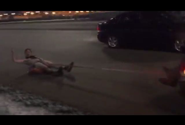 Далее молодой человек улегся на бублик горизонтально. За кадром слышна песня, в которой есть слова: «Кто этот сумасшедший русский?» При этом парень был одет не по-зимнему: на нем были только трусы, шапка, шарф и ботинки. Европейско-Азиатские Новости.