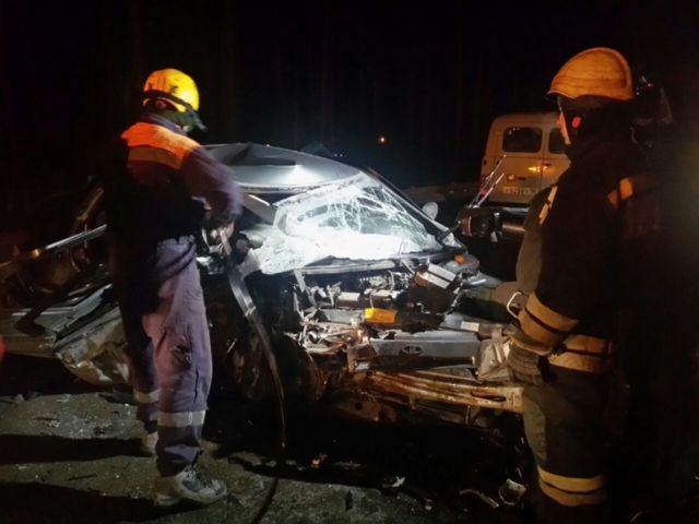 Вызволяли участников аварии 8 спасателей. По данным регионального МЧС, спасатели отсоединили клеммы аккумуляторов транспортных средств от бортовой сети и ликвидировали разлив горюче-смазочных материалов на трассе, чтобы не допустить возгорания. С помощью гидравлического и шансового оборудования пострадавших вытащили из искореженных авто.