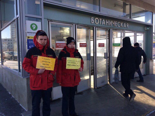 Четверо уральских студентов-спасателей провели акцию против терроризма. Молодые люди пришли с транспарантами к станции метро «Площадь 1905 года». Таблички гласили: «Санкт-Петербург-Екатеринбург. Мы вместе!», «Нет терроризму!», «Нас не запугать!».