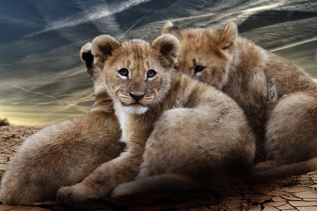 Львята рождаются слепыми и совершенно беспомощными, их глаза открываются приблизительно через неделю после рождения. Целый месяц самка не показывала потомство и держала детенышей в домике, который ей специально подготовили для родов. Теперь малыши окрепли, заметно подросли, и Эмма вынесла их из укрытия.
