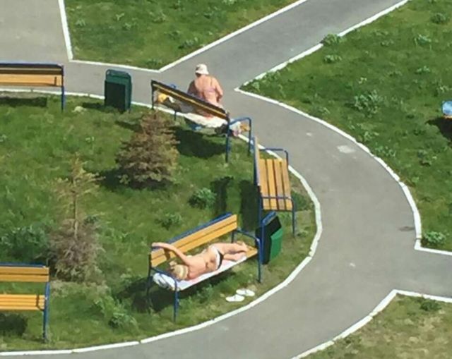 В минувшие выходные тюменские паблики облетело фото, где две дамы в панамках устроились загорать на скамейках прямо во дворе. «Такое происходит только в Ямальском 2 на ул.Арктическая 7 на детской площадке. Во дворе тренажерный зал и салон красоты (напротив). Где гулять детям? Подскажите людям, где пляж в Тюмени!», - так подписал автор свой снимок в группе «ЧС Тюмень» во «ВКонтакте».