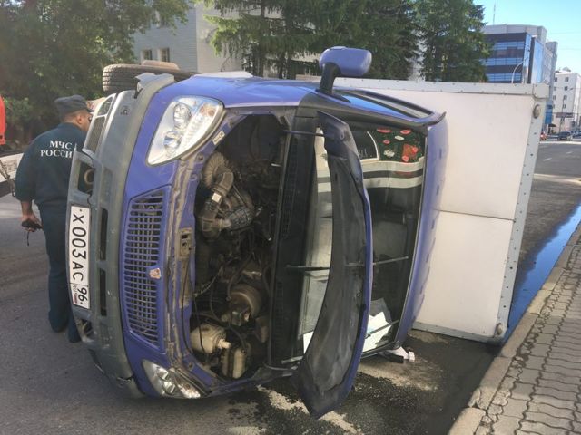 В центре Екатеринбурга, рядом с администрацией губернатора Евгения Куйвашева, перевернулась Газель. Из разбитой машины вытекает бензин.