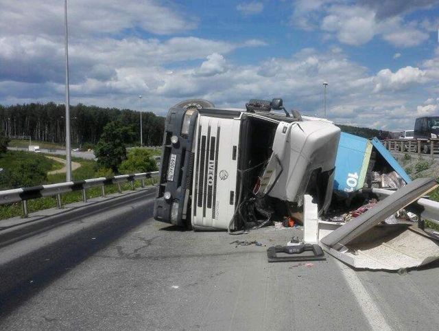 Сегодня в Екатеринбурге на Новокольцовской дороге перевернулась фура с баночным пивом, сообщает служба спасения «Сова».