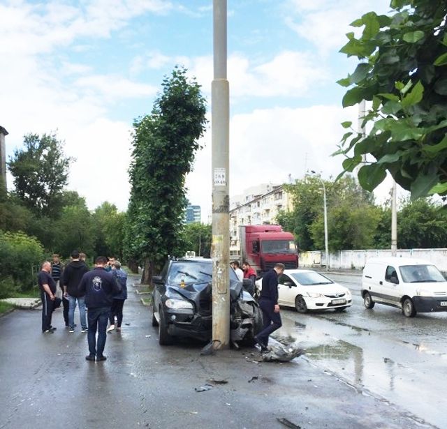 В центре Екатеринбурга кроссовер BMW X5 столкнулся с Honda Civic и врезался в столб. После ДТП пассажиры немецкого внедорожника, выглядящие довольно агрессивно, скрутили госномера.