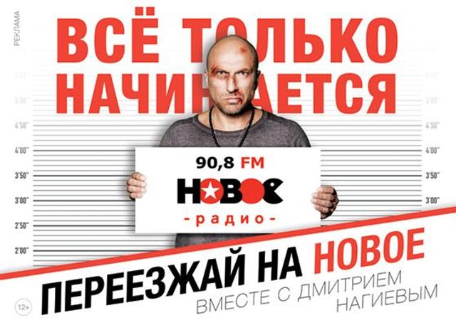 «Все только начинается.90.8 FM. НОВОЕ Радио. Переезжай на новое вместе с Дмитрием Нагиевым. Реклама 12+», - гласит надпись.