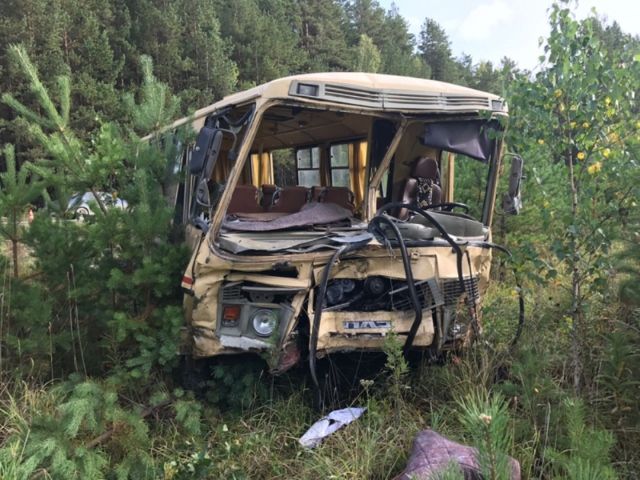 Судя по снимкам, пассажирский ПАЗ серьезно покорежило, а кабина иномарки, с которой он столкнулся, превратилась в груду металла. В результате ДТП обе машины съехали в кювет.