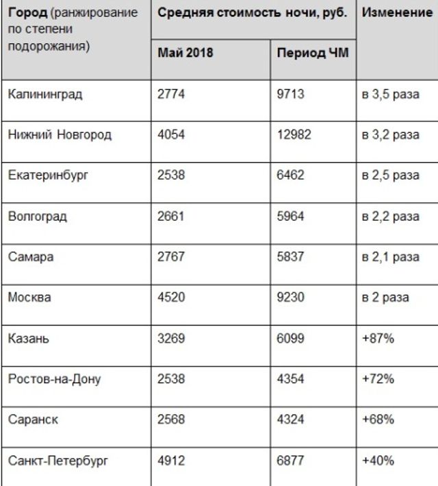 Из всех российских городов, которые будут принимать матчи, больше всего подорожали номера в Калининграде и Нижнем Новгороде — в 3,5 и 3,2 раза соответственно. Менее заметно цена за сутки проживания выросла в Сочи и Санкт-Петербурге — на 29% и 40%.