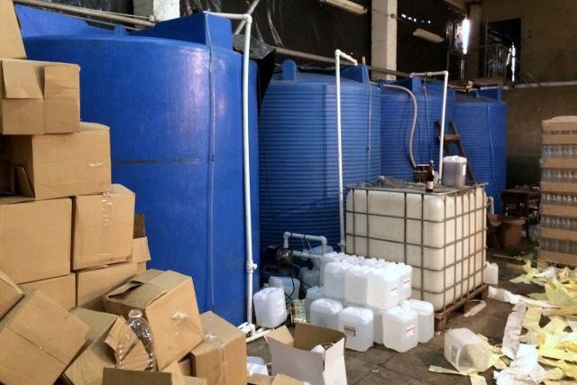 В ходе проверки помещений в Камышлове были обнаружены сразу 3 кустарные линии розлива, более 28 тысяч бутылок готовой продукции, 36 тысяч поддельных федеральных специальных марок, свыше 12 тысяч литров медицинского спирта производства ООО «Константа-Фарм М».