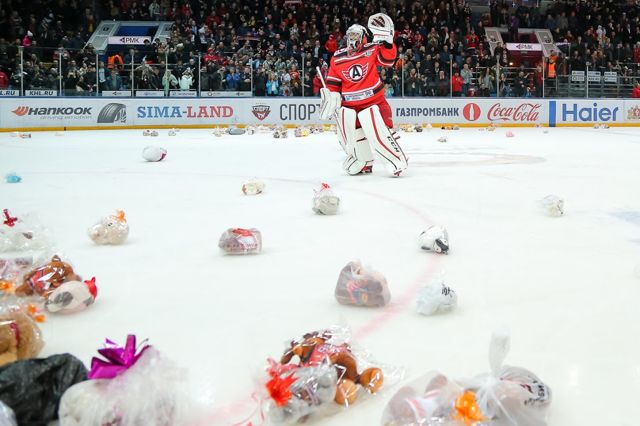 После финального гудка болельщики «Автомобилиста» выбросили на лед подготовленные заранее мягкие игрушки. Благотворительная акция «мишкопад», организованная в поддержку «Живого театра» Александра Пантыкина, стала для уральских любителей хоккея привычным мероприятием. Собранные игрушки будут направлены нуждающимся семьям и сиротам.