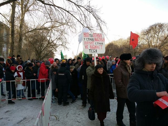 Демонстранты проходят через металлические рамки, возле которых уже выстроилась очередь. Полицейские дежурят как на входе, так и в толпе. В массе «бастующих» виднеются знамена движений «Екатеринбург за свободу», «Уральский мемориал», а также партии «Парнас» (однако официально свердловское региональное отделение партии «Парнас» осудило «забастовку избирателей»).