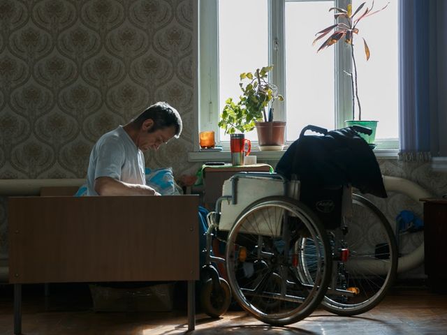 Евгению 49 лет. В приют в канун Нового года его привела волонтер. Евгений пообещал девушке, что не пропадет и пока держит слово. 15 лет жизни он провел в местах лишения свободы, отсидев с 14 лет три срока. Освободился в 2004 году. Уже через неделю вольной жизни потерял документы. А еще через два года после неудачного падения на гвоздь у бездомного началась гангрена, и с тех пор Евгений выживал на улице с одной ногой.