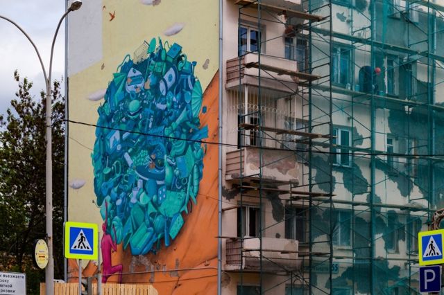 Речь идет о работе «Сизифов труд», которая была выполнена на фасаде дома в 2011 году украинской командой INTERESNI KAZKI.
