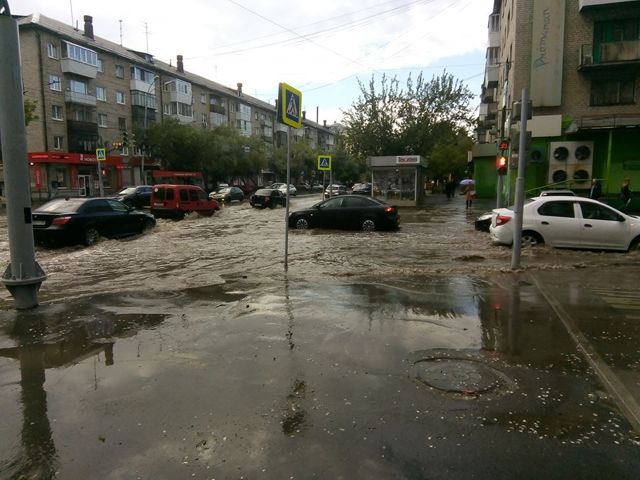 Из-за сильного ливня, который обрушился на уральскую столицу сегодня днем, по городским улицам разлились огромные лужи.