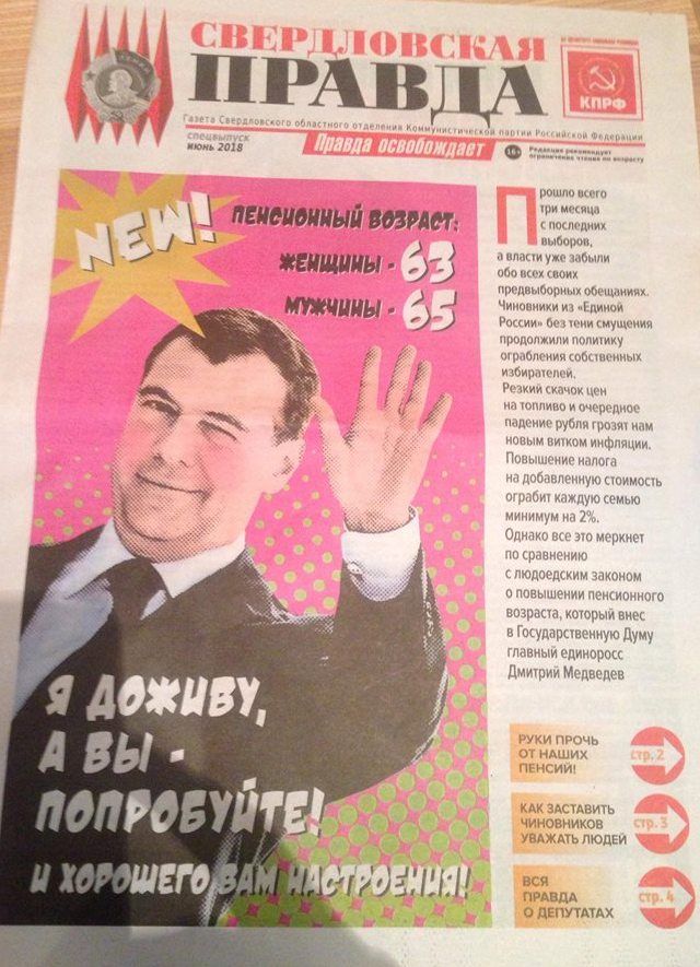 Издание КПРФ – первый в регионе агитматериал, посвященный критике реформы. Ранее стало известно о подготовке протестных митингов. Об организации акций уже заявили Федерация независимых профсоюзов Свердловской области, «Партия пенсионеров за социальную справедливость» и КПРФ.