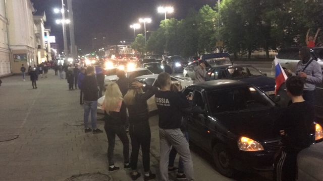 Екатеринбург бурно празднует победу сборной России над испанцами в 1/8 финала ЧМ-2018 по футболу. Напомним, матч закончился победой команды Станислава Черчесова в серии послематчевых пенальти. Основное время завершилось при счете 1:1.