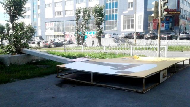 «Огромная конструкция упала в промежуток времени с 11:45 до 12:45. Она рухнула прямо на тротуар, где постоянно ходят люди, в том числе мамы с маленькими детьми. Это чудо, что никто не пострадал», - рассказала ЕАН жительница района Елена, выславшая фото в редакцию.